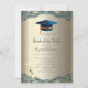 Casquette de graduation bleue, verre de champagne et confetti sur un arrière - plan de champagne. Cette invitation est facilement customisée pour votre événement en ajoutant simplement vos détails.