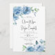 Élégant floral tout en un faire-part de mariage avec aquarelle peinte à la main fleurs bleu clair poussiéreux et verdure, script de calligraphie moderne avec détails et code QR RSVP dans le dos. Belle mariage moderne couleur bleu foncé, le tout dans une seule invitation. Vous pouvez personnaliser le libellé, la police, la couleur et la taille devant et derrière l'invitation. N'hésitez pas à me contacter pour le papier à lettres correspondant.