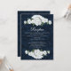Bleu marine avec une bordure blanche et invitation à la réception de mariage fleurie blanche.