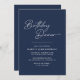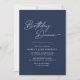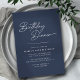 Des invitations à dîner d'anniversaire de style moderne et simpliste avec "dîner d'anniversaire" dans une police de caractères manuscrite. Texte blanc sur un arrière - plan bleu foncé contrastant.