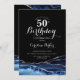 Invitation de fête d'anniversaire 50 ans bleu marine, noir et agate argentée. Design moderne élégant avec fond de géode de marbre d'agate aquarelle bleu royal, faux paillettes argentées et police de caractères script. Carte d'invitation tendance parfaite pour une célébration d'anniversaire de femme stylée. Invitations Zazzle imprimées ou modèle de template numérique imprimable instantané.