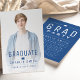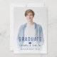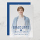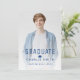 Annonces de graduation de typographie moderne et minimale avec photo, invitation de fête de graduation amusante sur le dos en bleu et blanc, Personnalisez-le avec votre propre photo et informations de fête.