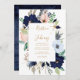 Cette faire-part de mariage à thème nautique présente des fleurs d'aquarelle bleu marine peintes à la main et rose. Personnalisez avec vos détails mariages dans la typographie de script en faux or moderne. Le dos de la carte a une texture d'aquarelle bleue correspondant. Meilleurs voeux pour votre mariage et mariage ! Conçu par Susan Coffey.