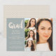 Moderne simple rétro bleu et beige Grad script 4 photos graduation faire-part avec collage style cabine photo, avec des points géométriques motif à l'arrière, toutes les couleurs sont modifiables.