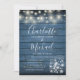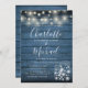 Un élégant faire-part de mariage rustique avec de jolies lampes à cordes, des jarres de maçon, des noms de script signature et une typographie chic sur un arrière - plan de bois rustique bleu. Conçu par Thisisnotme©