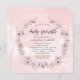 Cette délicate et belle invitation à l'arrosage de bébé présente un arrière - plan rose aquarelle élégant, avec une courre florale rose pâle aux accents bleu foncé.