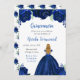 Cette invitation de Quinceanera présente des fleurs florales bleu marine de la parties scintillant et une belle princesse aux cheveux blonds et une robe élégante. C'est parfait pour une fête d'anniversaire de Quinceanera.