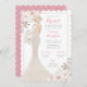 Une invitation à la douche nuptiale glamour présente une mariée dans une robe mariage en dentelle brillante et ornée de fleurs d'aquarelle rose et blanc. Plusieurs options sont disponibles pour les cheveux de la mariée et le teint de la peau.