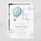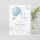 Cette charmante invitation au baby shower comporte une jolie montgolfière bleue et des nuages, ainsi qu'une élégante typographie de script. Avec votre code QR de registre et photo spéciale au verso. Conçu par Thisisnotme©