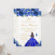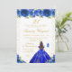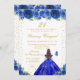 Cette invitation à la fête d'anniversaire élégante et glamour présente une belle princesse aux cheveux brunes et à la peau claire dans une robe de bal bleu royal. Le texte combine écriture manuscrite et polices sans serif modernes pour un look élégant et sophistiqué. Les compositions florales, les papillons et les confettis d'or créent un mélange parfait de rustique et de chic. Graphiques par www.etsy.com/uk/shop/SunflowerDayLove