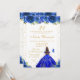 This elegant and glamorous birthday party invitation features a beautiful princess with brunette hair and fair skin in a royal blue ball gown. The text combines handwritten script and modern sans serif fonts for a classy and sophisticated look. The floral arrangements, butterflies and gold confetti create the perfect blend of rustic and chic.