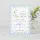 Celebrate your baby’s first birthday with a whimsical and heartwarming invitation! Featuring a cute white goose with a party hat and blue bow, floating against a soft background. The design is framed with a blue gingham border, decorated with ribbons, green leaves, and blue flowers—perfect for a cheerful party vibe!