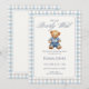 This blue gingham teddy bear baby shower invitation features a classic storybook-style teddy bear dressed in a soft blue outfit, framed by a timeless blue and beige gingham border. The elegant script “We Can Bearly Wait” creates a calm, traditional feel perfect for welcoming a baby boy.