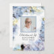 Invités Invitations de se souvenir de votre être aimé après leur passage avec l'élégante Blue Hydrangea Flowers Watercolor Celebration of Life Invitation. Cet élégant invitation commémoratif fleuri et personnalisé présente une photo florale peinte en numériquement aquarelle de fleurs d'hydrangée bleu clair avec un arrière - plan blanc.