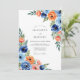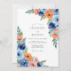 Vibrant watercolor blooms in shades of deep blue, bright orange, and soft coral create a lively floral display. Accompanying green foliage adds a natural, whimsical touch. This design evokes a fresh and celebratory mood.