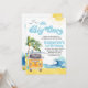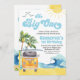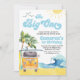 Blue Retro Van Wave Surf The Big One 1st Birthday Invitation Surfing thème garçon's la grande invitation d'un anniversaire avec un texte de style rétro bleu, palmiers, planches de surf, van et vague. Cette grande invitation d'un anniversaire comporte également un soleil et des mouettes.