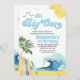 Blue Retro Wave Surf The Big One 1st Birthday Invitation Blue retro cap surf ou vague première invitation pour un bébé garçon avec une plage, palmiers, planches de surf, soleil et oiseaux.