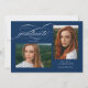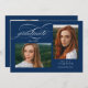 Blue Elegant Script QR Code 3 Photo Graduation Party Invitation présente un script magnifique et élégant superposant votre photo. Les détails de votre fête et la photo sont au verso, ainsi qu'un code QR pour la liste de souhaits de votre diplômé.