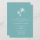 Cette simple invitation de mariage à la plage tropicale bleu de verre de mer minimaliste comprend deux palmiers en haut, avec un texte classique élégant.