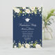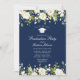 Une élégante invitation à la fête de graduation florale bleu foncé et blanc, avec photo à l'envers. Copyright Invitations élégants, tous droits réservés.