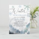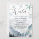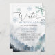 Carte d'invitation pour la fête d'anniversaire du garçon moderne avec aquarelle de la montagne d'hiver avec pins avec flocons de neige bleus. Le texte dit "Winter Wonderland".