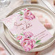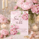 A romantic “Save the Date” wedding card featuring soft blush pink peonies in an elegant watercolor style.