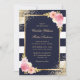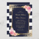 Invitations de mariage élégantes à fleurs blanches et dorées à fleurs roses et ivoire et verdure dorée encadrant les détails mariages dans un cadre doré contre un arrière - plan rayé bleu marine et blanc orné de confettis dorés. Éléments correspondants disponibles.