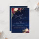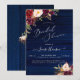 Invitation de mariage Bohème Rustique, avec fleurs aquarelles Bourgogne / Marsala et Pivoines Crème et fond en panneaux de bois bleu marine rustique.