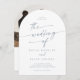 Cette photo en ardoise bleue et faire-part de mariage en arc de code QR est parfaite pour un mariage minimaliste. Le design bohème moderne, bleu et blanc pâle et poussiéreux, se compose d'une calligraphie rustique simple au style unique mais classique. Personnalisez le dos de votre invitation de mariage avec votre photo fiançailles préférée. Inclure un code QR pour que l'invité puisse facilement RSVP, afficher les détails ou les deux.