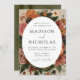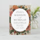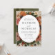 Élégantes invitations de mariage d'automne avec vos détails mariages nichés dans un cadre ovale entouré de fleurs d'aquarelle et de verdure dans des couleurs automnales muettes d'ivoire, d'orange, d'or moutarde, de vert olive, de rose et de marron. Les invitations de mariage florales d'automne s'inversent pour montrer un riche arrière - plan d'aquarelle vert olive. Conçu pour coordonner avec notre collection Boho Autumn Floral mariage.