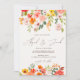 Voici notre charmant Boho fall Floral Mariage tout en un Invitation, un magnifique mélange de fleurs colorées à la main dans les tons rose, orange, jaune et vert. Cet élégant design présente des fleurs luxuriantes en cascade du haut et du bas, encadrant vos détails mariages avec une touche de la beauté de la nature bohème. La police de caractères élégante et moderne ajoute une touche sophistiquée et personnelle, complétant parfaitement le motif floral romantique. Idéale pour un été ou un mariage de automne, cette invitation donne le ton d'une fête joyeuse et inoubliable. Personnalisez-le avec vos détails mariages à l'arrière pour créer un souvenir unique et mémorable pour vos invités.