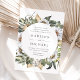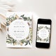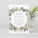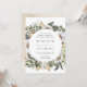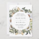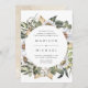 Elégante et unique faire-part de mariage fleurie avec ses détails mariages encerclés de fleurs d'aquarelle blanche et de feuillage luxuriant dans des tons riches de terre verte, beige et marron. L'invitation revient à un arrière - plan d'aquarelle beige clair.