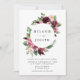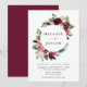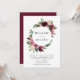 Invités Invitations à votre mariage dans le style avec nos élégantes invitations à mariage florales bordeaux et d'aquarelle. L'invitation affiche vos noms entourés d'un cadre circulaire de fleurs d'aquarelle rose rousse et bordeaux agrémenté de feuillage vert avec vos détails mariages ci-dessous. Personnalisez les invitations en ajoutant votre nom, votre date de mariage, votre heure, votre emplacement et les informations de réception. L'invitation revient à un solide arrière - plan bordeaux.