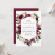Invités Invitations à votre mariage dans le style avec nos élégantes invitations de mariage bordeaux et bleu aquarelle à cadre floral. L'invitation présente vos détails mariages encadrés de fleurs d'aquarelle rose et bordeaux, agrémentées de feuillage vert. Personnalisez les invitations en ajoutant votre nom, votre date de mariage, votre heure, votre emplacement et les informations de réception. L'invitation revient à un solide arrière - plan bordeaux.