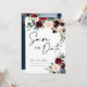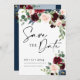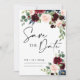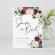 Boho Burgundy et Blush floral Enregistrer la date Invitation. Cette invitation est caractérisée par des roses boho bordeaux et rougis et des fleurs avec deux polices de haute classe modernes qui façonnent les tendances des événements festifs actuels et futurs.