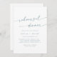 Cette invitation à la répétition chic et blanc de mariage est parfaite pour une soirée minimaliste avant la répétition mariage. Le design bohème moderne bleu vert et blanc présente une calligraphie rustique simple avec un style unique mais classique qui rappelle la plage côtière et une croisière d'été sur l'océan.