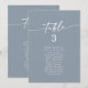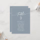 Ces cartes de sièges chinées et chic, bleues et poussiéreuses, sont parfaites pour un mariage minimaliste. Le design moderne et bohème, bleu clair neutre, présente une calligraphie rustique simple, avec un style unique mais classique. Ce tableau peut être utilisé sur la table ou comme carte de sièges suspendus. La conception s'imprime à l'avant et à l'arrière. Personnalisez chaque numéro de table dont vous avez besoin, en ajoutant chacun à votre panier individuellement.