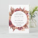 Faire-part de mariage fleurie unique et élégante, avec ses détails mariages encerclés de fleurs d'aquarelle bordeaux, violets, rousses et corail et son feuillage luxuriant dans des tons beige et marron. L'invitation revient à un arrière - plan d'aquarelle beige clair.
