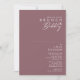 Ce brunch et cette invitation à la douche à bulles et au violet de Dusty Boho est parfait pour votre mariage boho rustique coloré. Son design moderne simple et unique, accompagné d'une écriture contemporaine minimaliste, d'un rose poussiéreux et d'une palette de couleurs mauve violet, donne à ce produit une atmosphère bohème chic classique. Gardez-le tel quel, ou choisissez de le personnaliser avec des illustrations ou des graphiques de votre choix. Vous pouvez également chercher d'autres produits dans cette collection pour réunir votre mariage entier !