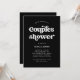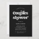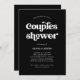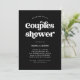 Cette simple et boho invitation de fête de couple de mariage présente une typographie rétro blanche sur un fond noir foncé.