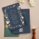 Une faire-part de mariage boho avec une touche moderne. Un cadre fleuri fleur sauvage rose pâle et jaune pâle entoure l'information mariage sur un arrière - plan de la marine. À l'arrière, il y a des espaces modèles pour ajouter des détails et le code QR pour vos invités à scanner et RSVP sur votre site Web. Idéal pour le printemps, l'été d'automne.