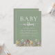 Une belle bordure florale d'aquarelle fleur sauvage décore le bord inférieur de cette invitation à baby shower boho tendance. Les mots "Baby in florom" apparaissent dans les polices serif et script, avec des swashes avant et après le script. Personnalisez le texte avec le nom de la future maman et les détails de la douche en blanc sur un arrière - plan vert sage. L'envers offre de l'espace pour la tombola de couche, les livres pour bébé, et les détails du registre (ou n'importe laquelle des trois catégories de votre choix), ainsi qu'un code QR pratique que les clients peuvent scanner pour visiter le registre.