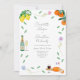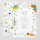 Magnifique invitation de mariage aquarelle moderne et colorée sur le thème du fromage et du vin, avec des éléments botaniques simples, un thème de citrus orange et citron, idéale pour un mariage ensoleillé d'été sur le thème européen. L'illustration originale de l'artiste Catherine Sweetman comprend du feuillage, des fleurs sauvages, du fromage et du vin français, le drapeau français, des notes de musique et des coupes de champagne pétillant. Écriture fantaisiste et typographie moderne avec des modèles faciles à personnaliser pour ajouter les noms, la date et d'autres informations essentielles ainsi que les initiales des mariés sur l'étiquette de la bouteille de vin pétillant. La palette de couleurs comprend le citron, le jaune, l'orange, le vert, le bleu, le violet et le rose.