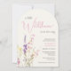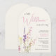 An elegant and whimsical light cream arch-shaped baby girl shower invitation featuring "a little wildflower is on her way" in a blend of grey typography and a stylish pink script, and a boho-inspired watercolor bouquet of dainty purple, pink and yellow wildflowers.