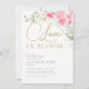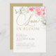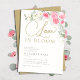 Une invitation à la douche nuptiale "Love is in Bloom", élégante et moderne, avec un bouquet luxuriant de roses d'aquarelle, d'orchidées, d'eucalyptus et d'autres feuilles d'or (pas d'or réel, c'est un effet numérique), ainsi qu'une calligraphie moderne.