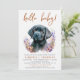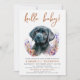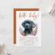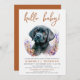 Invitation vos amis et votre famille pour célébrer l'arrivée de votre nouveau bébé avec cette adorable invitation de chiot de douche, accessoires de fête et cadeaux d'extraction du labrador noir. Cette invitation baby shower présente un chiot de laboratoire noir peint à la main, parfait pour les amoureux de les chiens ! Le design est moderne et tendance, avec une palette de couleurs orange en terre cuite et violet et le texte "bonjour bébé" pour célébrer l'arrivée prochaine d'un bébé garçon ou d'une fille. DROIT D'AUTEUR © 2023 Judy Burrows, Black Dog Art - Tous droits réservés. Boho Moderne Chien Chien Chien Terracotta Baby shower Invitation