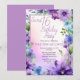 Elegant purple and blue floral design "Sweet 16 Birthday Party" design featuring a floral frame of morning glories and aster flowers, on a pastel-toned watercolor background.