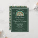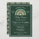 Cette invitation au baby shower mignonne et fantaisiste présente un arc-en-ciel bohème en vert et marron avec des coeurs blancs sur un arrière - plan vert foncé. Le texte combine écriture manuscrite et polices serif pour un look élégant et moderne.