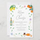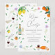 Magnifique invitation de mariage ou de fiançailles bohème chic à thème fromage et vin, aquarelle moderne et colorée avec des éléments botaniques simples, thème de citrus orange et citron idéal pour une fête de fiançailles ou un mariage estival ensoleillé sur le thème européen. L'oeuvre originale de l'artiste Catherine Sweetman comprend du feuillage, des fleurs sauvages, du fromage et du vin, des notes de musique et des coupes de champagne pétillant. Écriture fantaisiste et typographie moderne avec des modèles faciles à personnaliser pour ajouter les noms, la date et d'autres informations essentielles ainsi que les initiales des futurs mariés sur l'étiquette de la bouteille de vin pétillant. La palette de couleurs comprend le citron, le jaune, l'orange, le vert, le bleu, le violet et le rose.