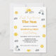 Célébrez le premier anniversaire de votre petit soleil avec cette simple mais adorable invitation de fête d'anniversaire autour du soleil ! Un soleil en terre cuite bohème et une typographie charmante sont présentés dans ce design.